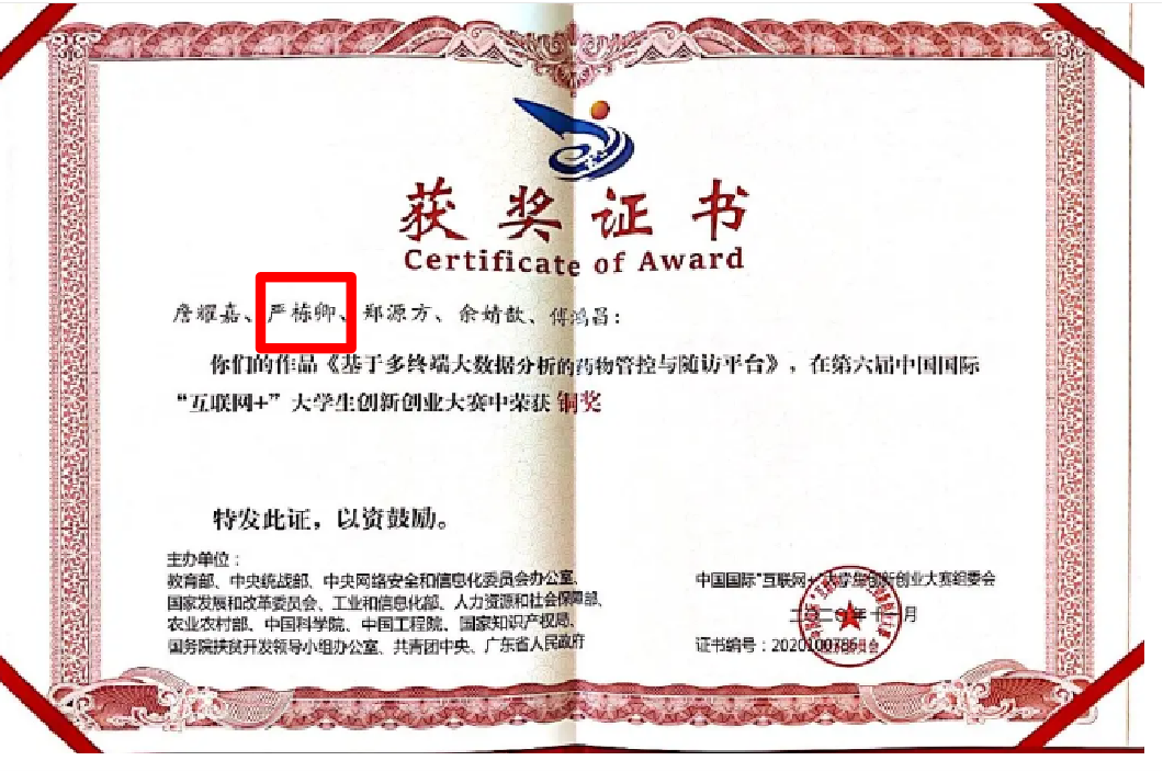 人物介绍/span> /span>/span> /p> 严栋卿,来自普惠金融1902班,是学院团委副书记,也是普惠金融2003班班助。获得院、校、省级奖项15余项,志愿时数150小时;喜欢瞎逛干饭,也喜欢看书泡图书馆;最喜欢的还是出门实践长见识啦。/span>/p> 图 | “基于多终端大数据分析的药物管控与随访平台”项目获第六届中国国际“互联网+”大学生创新创业大赛国赛铜奖 竞赛人 /span> Q:在比赛中,你所遇到意想不到的挑战是什么?/span> Q:你认为在此类比赛中最需要的能力或者品质是什么?/span> Q:参加此次比赛你最大的收获是什么?/span> 经验分享/span> 我认为创业类型的项目更适合跨专业的合作,需要大家跨出自己的交际圈,认识不同专业的朋友,例如我做这个比赛就是一次很偶然的机会,非常感谢项目负责人的邀请。/span>