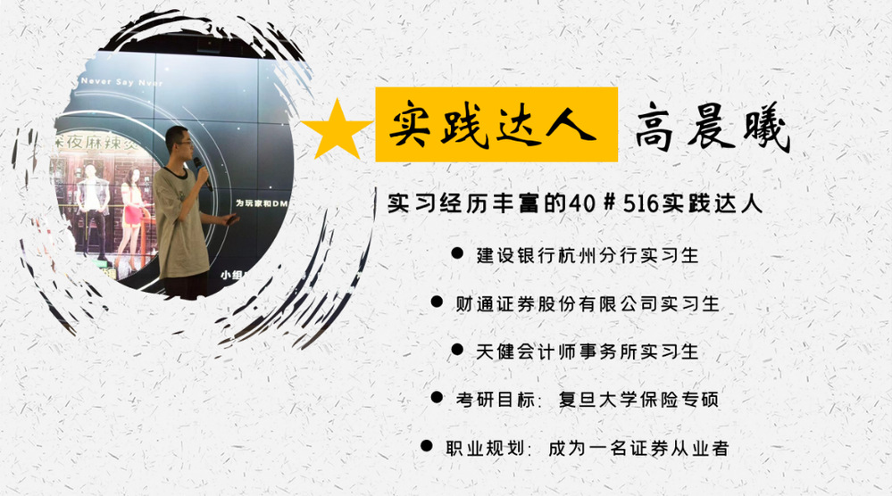 高晨曦作为寝室实践达人,实习经历丰富,两年内利用寒暑假时间共参加三次实习工作,首先是建行杭州分行的“金智惠学”优才成长计划,参与银行知识讲座、职场经验分享、名企参观以及网点实习等活动;其次是财通证券,职务是投行部承做岗实习生;最后是天健会计师事务所。在寝室他乐于分享实习时的所见所闻,帮助室友进行未来职业规划。
