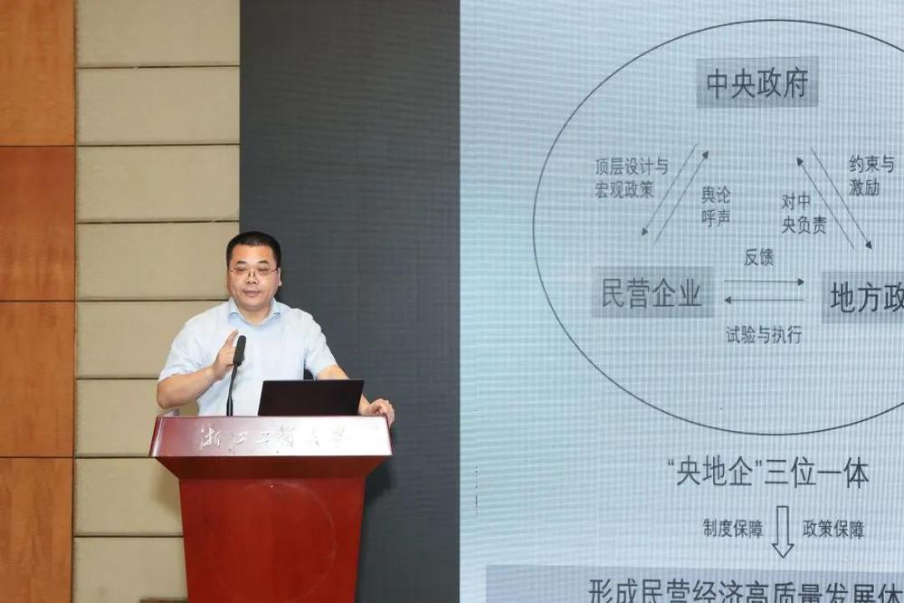 浙江大学经济学院副院长潘士远教授就我国民营经济的重要性与其发展阶段、发展现状等方面展开论述。他指出民营企业以小微企业为主,面临着创新发展、协调发展、绿色发展、开放发展、共享发展、融资保障方面的诸多问题。他强调,“央地企”三位一体治理框架有利于推动形成民营经济高质量发展的体制机制,是推动民营经济发展质量变革、效率变革、动力变革的重要制度保障与政策保障。他还从创新、竞争、融资与环境四个维度系统性提出了民营经济转向高质量发展的政策举措。