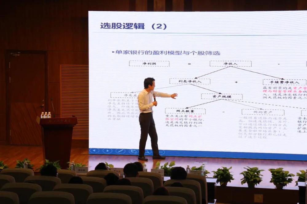接着,王剑教授分享了个股方面的有关知识与其丰富经验,为我们介绍了成熟的个股分析方法。通过简单模型为师生们展示了计算方法与过程,通过“ROA”“ROE”概念为大家提供了股票风险估计。引入各类银行数据分析表,分析了大、中、小型银行重点关注目标,并以此比较了工商银行、招商银行、泰隆银行三类代表性银行的商业模式。