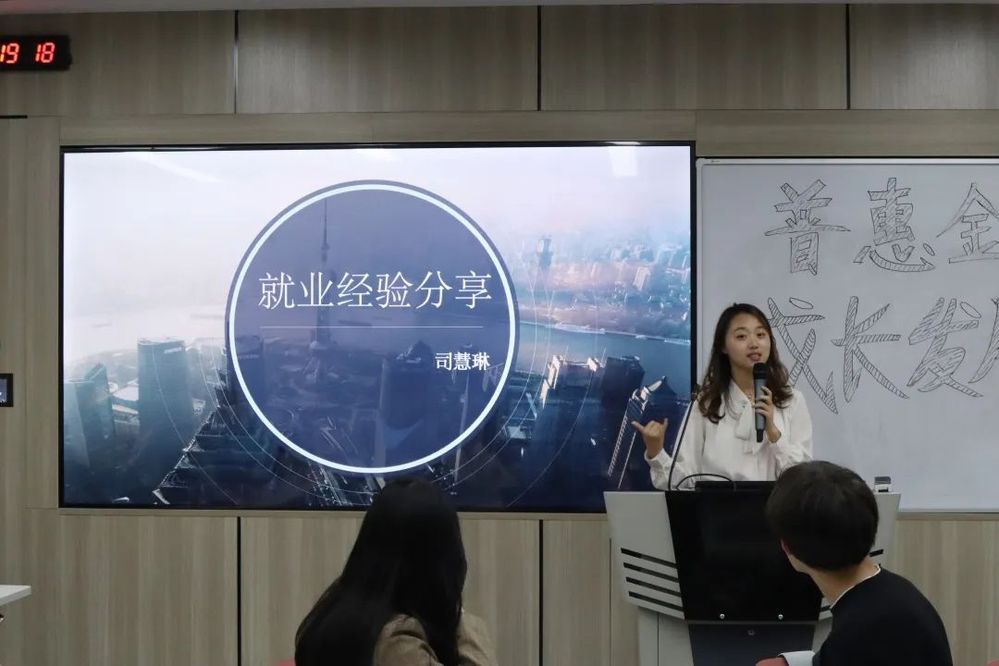 司慧琳校友2019年保研到西南财经大学攻读硕士学位,目前就职于融通基金管理有限公司,担任渠道经理、浙江区域负责人。她分享的主要是择业经验,司慧琳学姐讲述了金融类专业学生未来五大主要就业方向分别是银行、券商、基金、保险、期货/信托,还有一些是金融租赁公司,资产管理公司等。目前这五大行业的要求都比较高,在学历上至少需要硕士研究生。司学姐还认为在求职过程中,学历最重要,其次是实习,然后才是证书,所以她建议学弟学妹们还是要努力考取研究生,然后在校期间多多实习,寻找到自己的兴趣爱好为未来的职业发展提供经验。最后司学姐向我们介绍了获取实习机会的渠道。