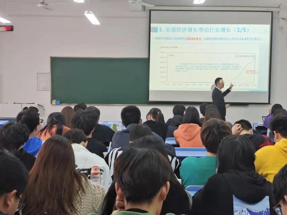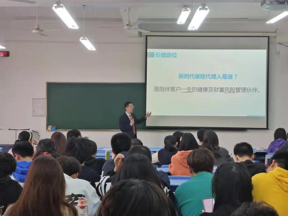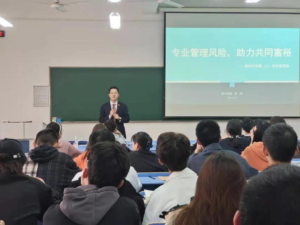 11月3日下午,新华保险杭州中支党支部副书记、副总经理梁一鸣应邀来到韩国h漫 ,在经济楼304教室为2021级同学做了题为“专业管理风险,助力共同富裕”的讲座。