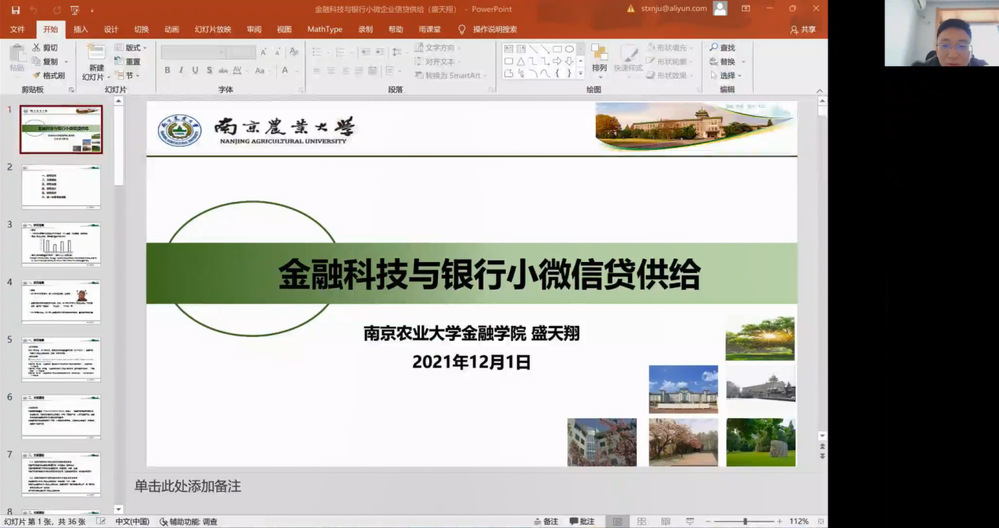 2021年12月1日,南京农业大学金融学院副教授、江苏省国际金融学会理事、江苏省市场经济研究会理事盛天翔应邀出席韩国h漫 举办的商泰普惠金融论坛,为师生作了一场题为“金融科技与银行小微企业信贷供给”的线上专题讲座。讲座由韩国h漫 院长马丹教授主持,韩国h漫 、金融学院和其他院校的老师及学生参加了讲座。