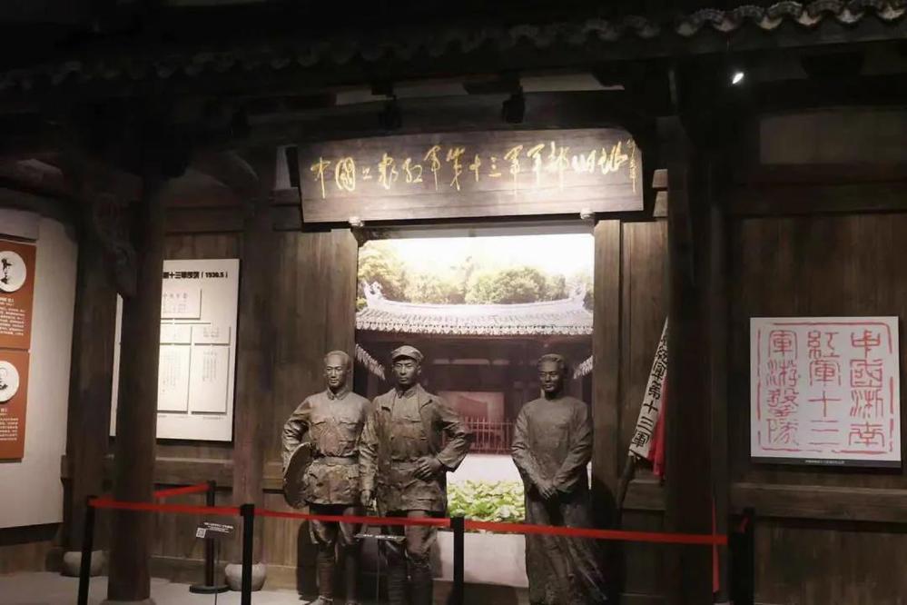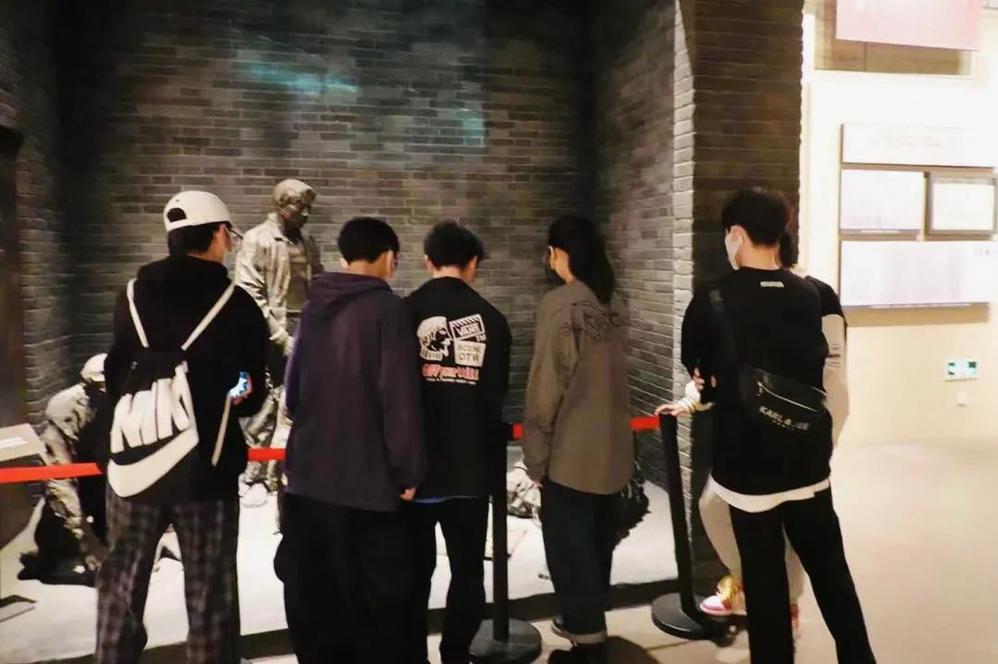 然后我们看到的是纪念馆三楼,它主要展现了新民主主义革命时期到抗日战争时期的浙江省英勇战斗的革命烈士的故事。这一部分以浙江抗战历史的地域为特色,结合浙江儿女前赴后继、英勇斗争的抗战历史,通过雕塑、影像图文资料、互动体验等多种形式让同学们沉浸深入地体验浙江革命先烈的英雄事迹。