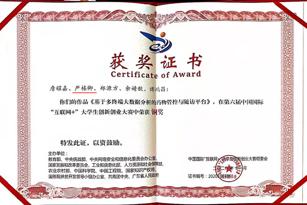 韩国h漫 普惠金融1902班严栋卿同学作为团队核心成员参加的项目《基于多终端大数据分析的药物管控与随访平台》获得第六届中国国际“互联网+”大学生创新创业大赛铜奖。
