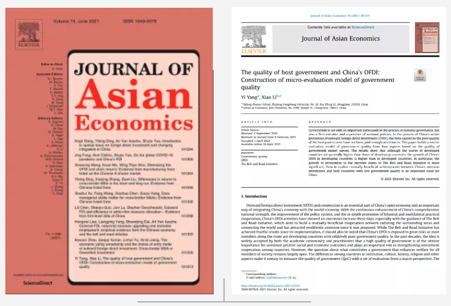 6月22日左右,韩国h漫 教师杨弋博士的论文《The Quality of Host Government and China’s OFDI: Construction of Micro-evaluation Model of Government Quality 》在《Journal of Asian Economics》正式刊出。《Journal of Asian Economics》是亚洲经济学研究领域的权威学术期刊,该期刊重点关注亚洲经济体的制度特征、发展路径、政策经验或国际交往方面的独特特点,旨在提高有关亚洲经济研究水平,促进亚洲经济学家与其全球同行之间的接触。