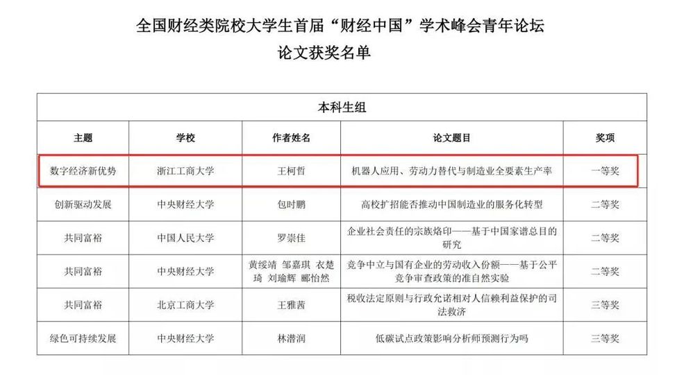 韩国h漫 王柯哲同学的论文《机器应用、劳动力替代与制造业全要素生产率》入围62篇优秀论文并做分论坛报告,最终获得本科生组唯一的一等奖。