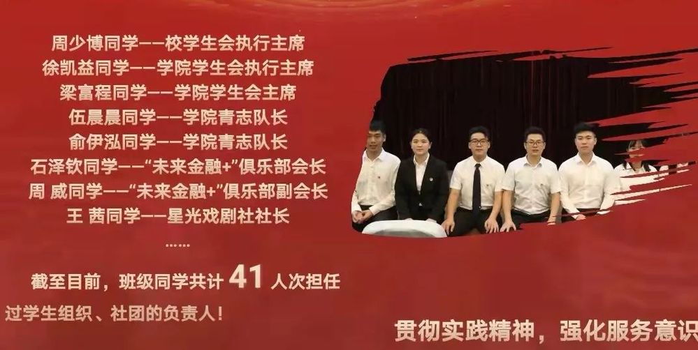 普惠金融1901团支部贯彻实践精神,强化服务意识。团支部中担任学生组织、社团负责人共41人次。其中包括校学生会执行主席、学院学生会执行主席、学院学生会主席团成员、学院青志队长、“未来金融+”俱乐部会长、“未来金融+”俱乐部副会长、星光戏剧社社长等。在交流研讨会上,他们聆听学术大家与企业家间言语的激烈交流。在市场调研中,他们共探小微脉搏,感受真实经济。为了感受职场氛围,普惠金融1901团支部成员进入阿里巴巴、中国银行等公司实习,班级实习率达100%。
