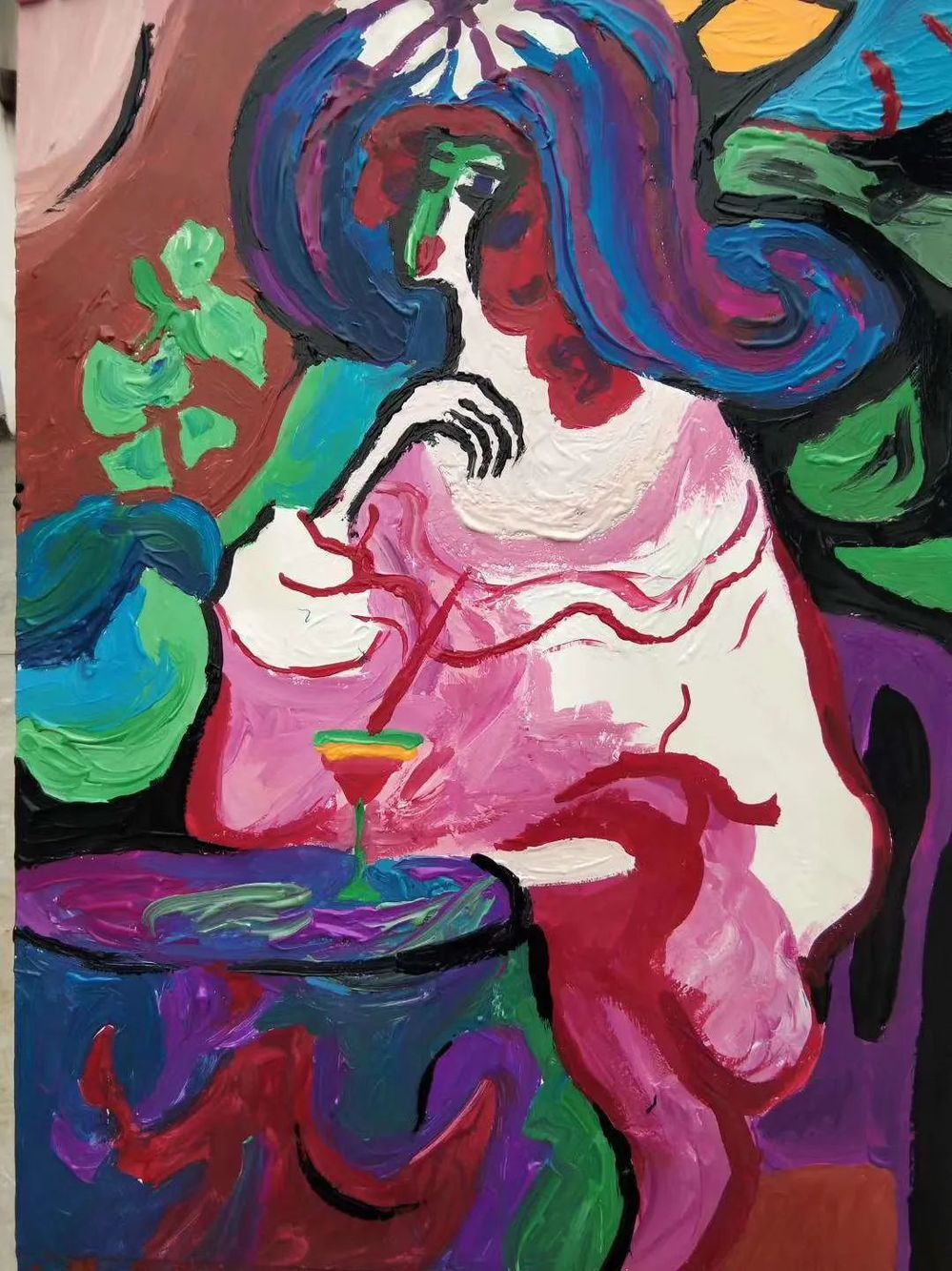 这幅画展现了一位在享受下午时光的女人。她坐在桌边,桌上放着刚调制好的饮品。阳光从窗外照射进来,映射在了她的半边脸上。她独自享受着这份清闲,在这高速运转的社会中,能够静下来,享受闲暇的时光,这是一件多么美好的事情!