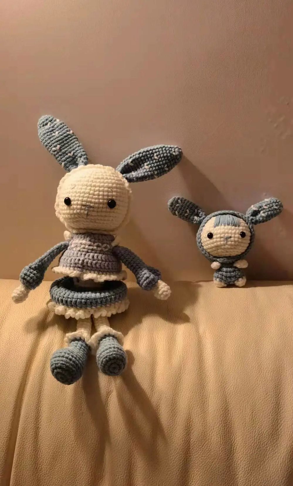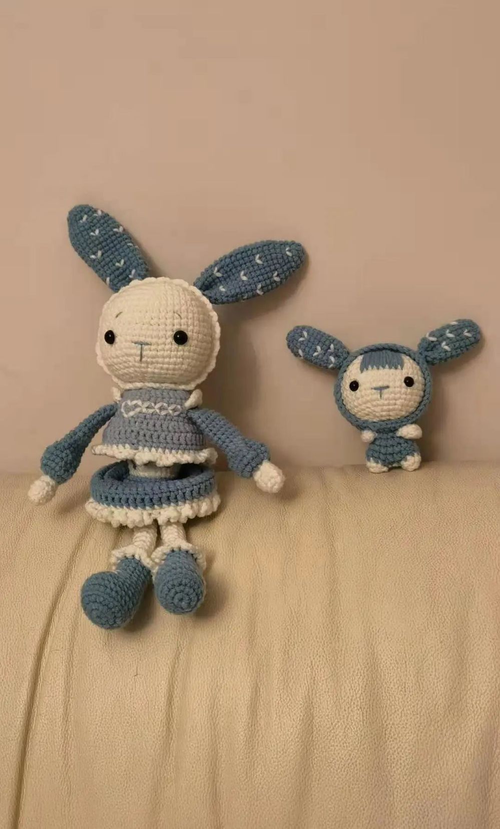 这次我制作的心灵手办是用钩针编制的小兔母子。自从在大一下学期在零度工艺社的例会上接触到了钩针,我就立马喜欢上了这种手工。那时候,只要是没课的时间,我都巴不得立马飞奔到寝室桌前抓起一团毛线和一根针开始钩织。虽然一开始我钩得并不好看,但是慢慢地,当我熟悉了各种针法之后,我也逐渐地进步了,也能钩出更加美观的作品。这一对小兔子,是我在去年暑假里钩的。我觉得钩针很有意思,毕竟作为一个学金融的学生,每天的课程基本都是和单调的数字打交道,但是自从我开始玩钩针之后,我的生活变得丰富了起来。我觉得看着自己钩出来的小动物,心里就会有满满的成就感,所有的不开心都被治愈了。因此我今天想把我钩的兔子分享给大家,希望大家天天都有好心情~