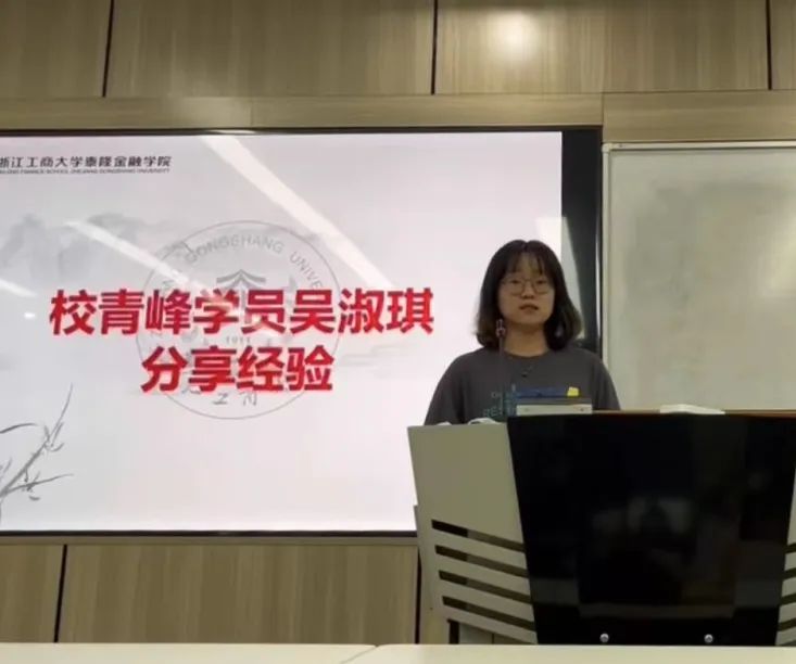 普惠金融1902班吴淑琪学姐是普惠精英班第一期学员,结业后作为学院班优秀学员参与校青峰班选拔,最终被成功录取为第七期校青峰班学员。她介绍了校青峰班的主要情况并分享了面试经验。她认为校青峰班学风优良、活动丰富,是我校最优秀学生的组织之一。同时,吴淑琪学姐还鼓励在场同学们多参加有意义的活动,不断在实践中锻炼提升个人能力。