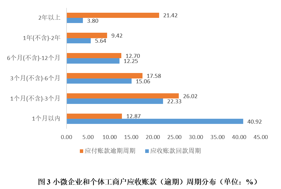 调查发现,小微企业在资金链方面面临着三大困境:(1)小微企业的应收账款与应付账款存在错配,表现为有应收账款的小微企业比例远高于有应付账款的小微企业比例,且面临应收账款逾期的小微企业比例远高于应付账款逾期的小微企业比例;(2)小微企业应收账款逾期时间较长,超三成小微企业的逾期时间在1年以上;(3)小微企业的应收账款逾期问题在经济下行时可能引发系统性风险。