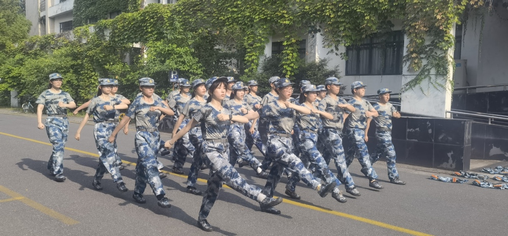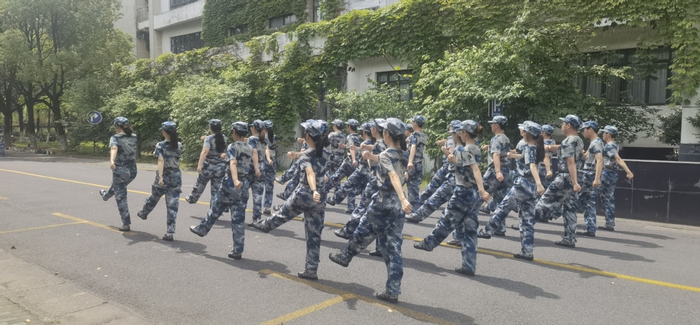 按照训练计划,同学们要学习踢正步,这对身体的平衡、姿态和力量的要求都非常高。同学们挺胸收腹,头微微抬高,目含坚定正视着前方,挺拔如松,方阵齐整。