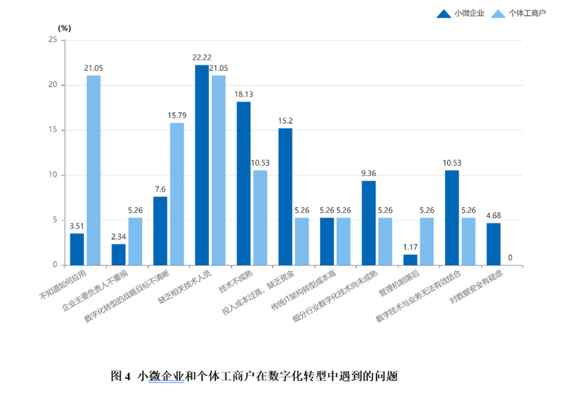 小微企业数字化转型进度缓慢的主要原因表现为:缺乏相关技术人员,技术不成熟,投入成本过高、缺乏资金等。个体工商户还面临着不知道如何应用和战略目标不清晰等问题。此外,还存在一些次要原因,例如数字技术与业务无法有效结合、细分行业数字化技术尚未成熟、传统IT架构转型成本高、管理机制落后、对数据安全有疑惑、以及不知道如何应用数字化等。