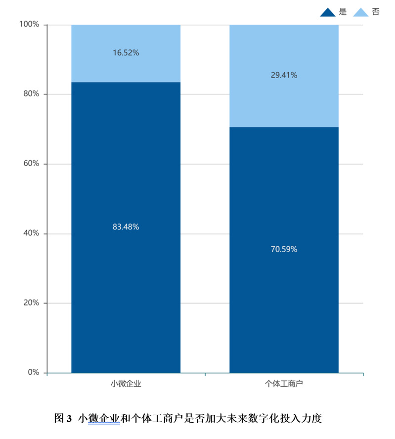 从数字化转型的未来投入力度来看,超过八成的小微企业和超过七成的个体工商户都愿意在未来加大数字化转型的投入力度。