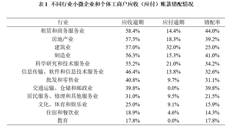 调查发现,小微企业在资金链方面面临着三大困境:(1)小微企业的应收账款与应付账款存在错配,表现为有应收账款的小微企业比例远高于有应付账款的小微企业比例,且面临应收账款逾期的小微企业比例远高于应付账款逾期的小微企业比例;(2)小微企业应收账款逾期时间较长,超三成小微企业的逾期时间在1年以上;(3)小微企业的应收账款逾期问题在经济下行时可能引发系统性风险。