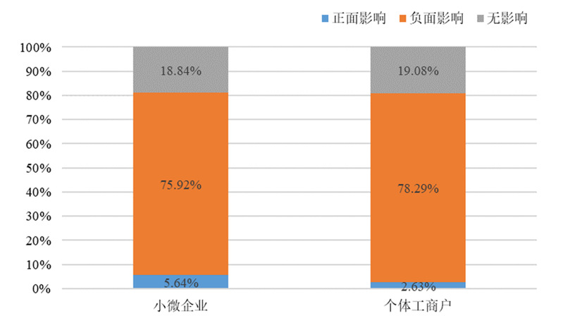 将新冠疫情的影响划分为正面影响、负面影响和无影响。调查结果表明,超过七成的小微企业和个体工商户都受到了新冠疫情的负面影响,仅有不到两成的小微企业和个体工商户没有受到影响,以及极少量的小微企业和个体工商户受到了正面影响。这表明,新冠疫情给小微企业和个体工商户带来了较大的冲击。