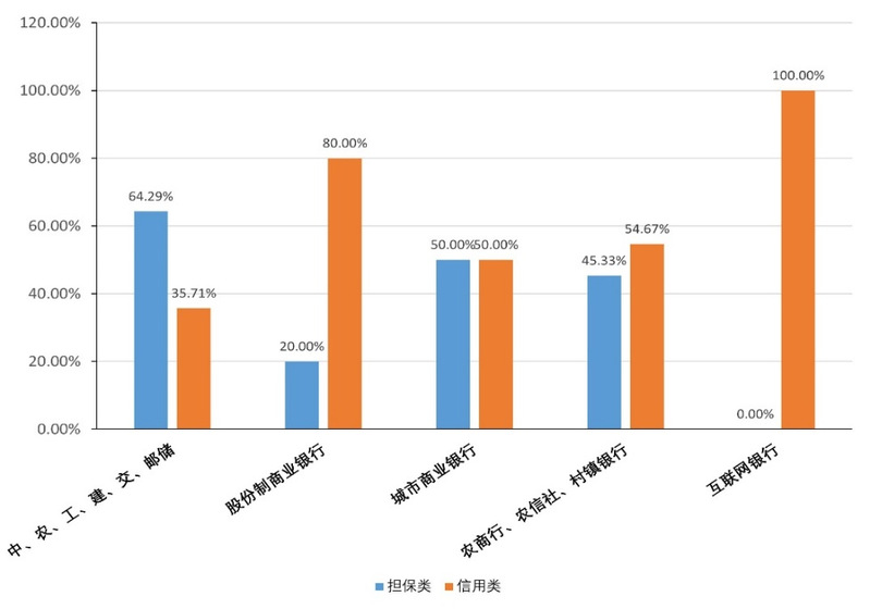 为何大型国有银行的首贷利率更低,一种解释是其客户的风险更小,这也得到了调研数据的支持。如图5所示,大型国有银行提供的首次贷款中有64.29%为担保类贷款(抵押、质押、保证等),在所有银行类型中占比最高。而信用类贷款只占35.71%,低于城市商业银行等中小银行的比例。
