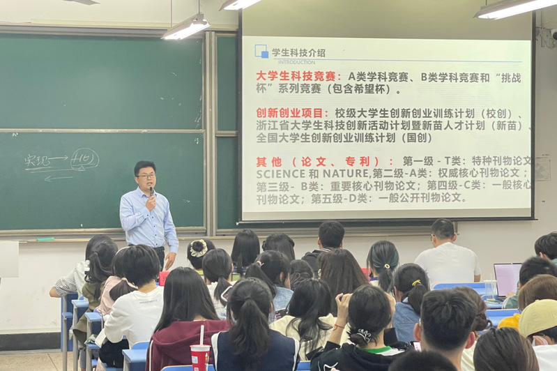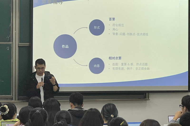 张明飞老师以“成为更好的自己”为主题,围绕“什么是学生科技”“为什么要参加学生科技”“学生科技的种类”“参与学生科技的途径”这四个方面向同学们系统地介绍了大学期间的相关竞赛,使同学们对竞赛有了初步的认识,鼓励同学们通过参加学生科技竞赛锻炼学术思维、提高综合能力、丰富专业知识和自身履历。