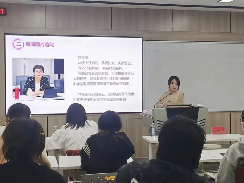 公管学院新汇宣发中心负责人张沁同学的分享主要有工作流程、推送规范、部门合作三个部分。她以新闻为例,讲述了新闻制作的工作流程、标题规范、排版规范、写作规范等内容。尤其是在新闻图片选取方面,张沁同学针对全景图、中景图以及特写图的摄取范围进行了详细的讲解,在座同学都受益匪浅。