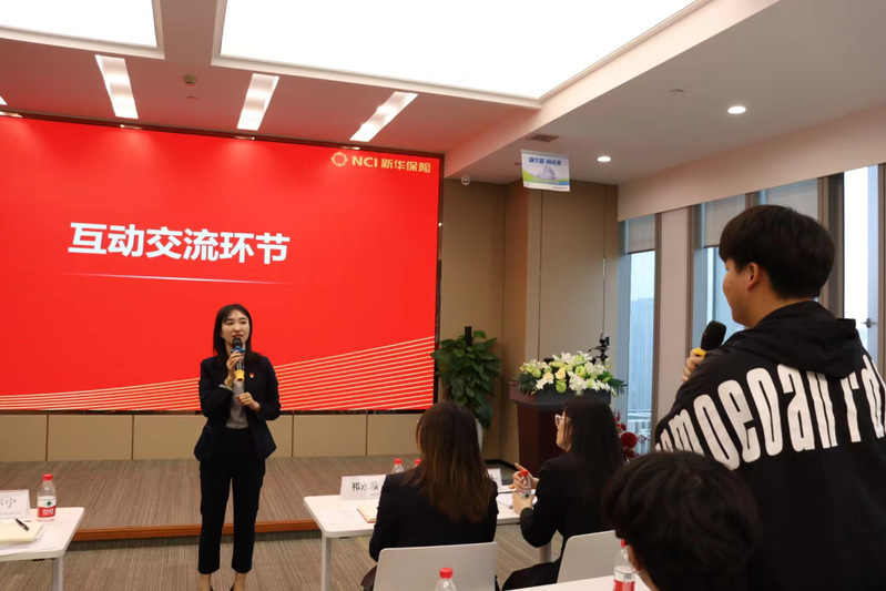 本次活动同学们依次参观新华保险职场工作环境,了解新华保险发展历程,并且聆听了新华保险浙江分公司人力资源绩效管理室负责人祈永霞和培训部池依曼学姐的分享,并与人力资源部负责人陈亦宁进行了互动交流。