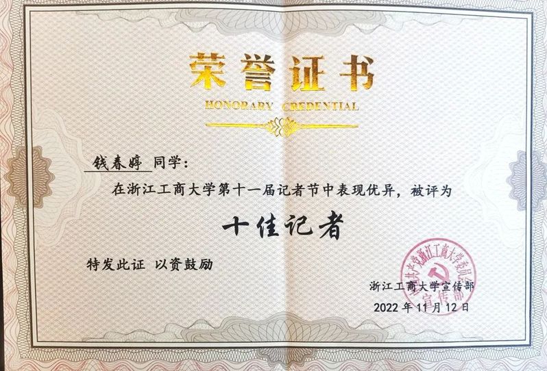 热烈祝贺韩国h漫 钱春婷同学荣获校“十佳记者”称号