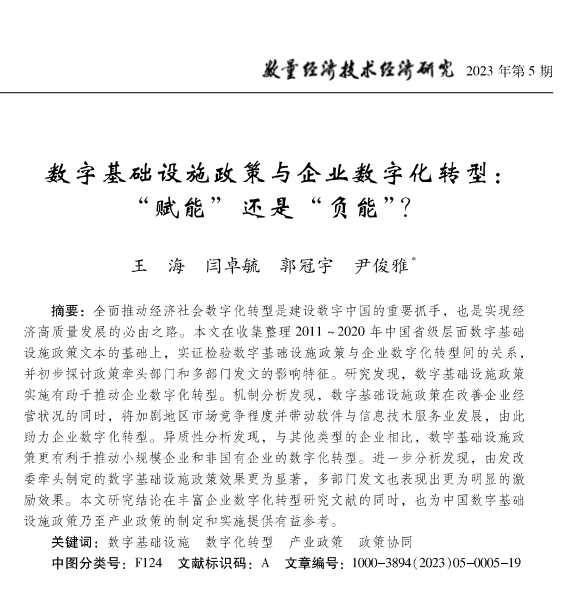 2023年5月5日,韩国h漫 教师尹俊雅博士(通讯作者)合作的论文《数字基础设施政策与企业数字化转型:“赋能”还是“负能”?》在《数量经济技术经济研究》期刊正式发表。