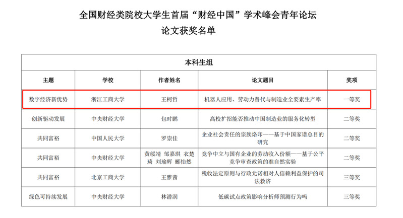 王柯哲十分关注数字经济的前沿领域,“数字经济新优势”主题成为了他大学科研之路的主旋律。在大三,他的论文《机器人应用、劳动力替代与制造业全要素生产率》获得了全国财经类院校大学生首届“财经中国”学术峰会青年论坛本科组唯一的一等奖。