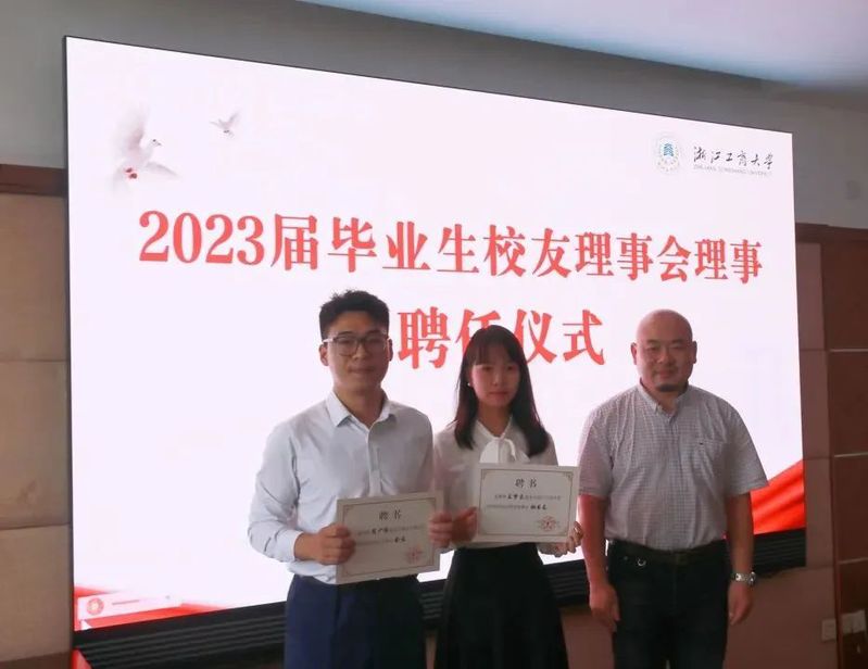 大会举行了2023届毕业生校友理事聘任仪式,王忠华主任宣读聘任文件。据各学院及部门推荐,学校校友总会审核,聘任普惠金融1901班周少博为2023届毕业生校友理事会会长、工商1901班王梦兰为秘书长,毛晓莹等27位毕业生被聘任为理事。