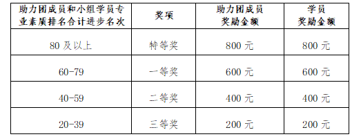 奖励对象:以学习互助小组为单位,学习互助小组由助力团成员和学员组成,两人互助学习共同提高学业水平。