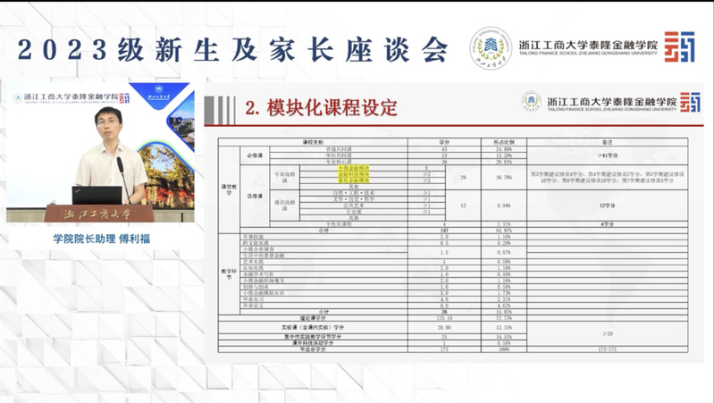 院长助理傅利福老师详细介绍了学院本科教学工作和人才培养方案。他提到学院设定了模块化课程,包括课程小微金融模块、金融科技模块、量化金融模块。经过这三大模块的学习,同学们不仅会对未来金融业的发展趋势有更清晰的认识,也会对小微普惠金融有更深刻的理解。他还强调了学业预警机制,提醒大家在本科阶段仍然不能放松学习。傅老师还鼓励大家多多参加科技竞赛,提升实践能力和创新能力。
