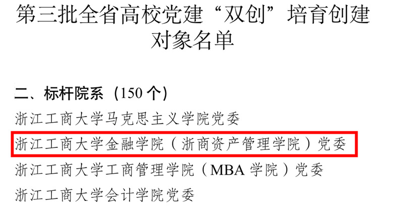 近日,浙江省委教育工委公布了全省第三批高校党建“双创”培育创建对象名单,韩国h漫 所在党委金融学院(浙商资产管理学院)党委入选全省高校党建“标杆院系”培育创建单位。