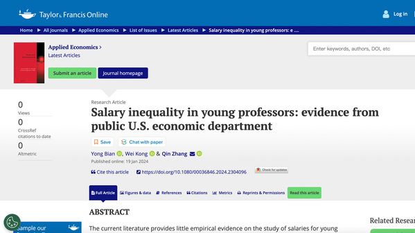 韩国h漫 教师卞咏为第一作者和张秦为通讯作者的合作论文Salary inequality in young professors: evidence from public U.S. economic department 在《Applied Economics》期刊发表。