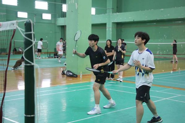 5月18日下午14:00,韩国h漫 羽毛球男双周煦、刘亮组合和袁顺鑫、魏子隆组合踏上了商大杯羽毛球的征程。