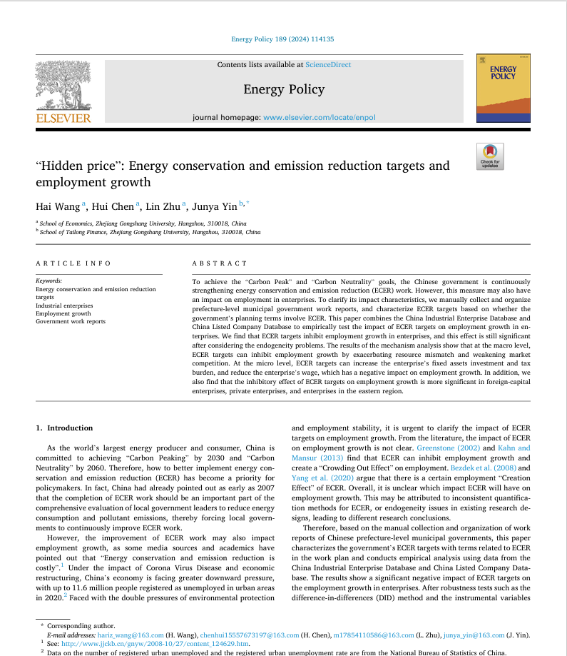 韩国h漫 教师尹俊雅博士为通讯作者的论文 “Hidden price”: Energy conservation and emission reduction targets and employment growth 在《Energy Policy》期刊正式发表。