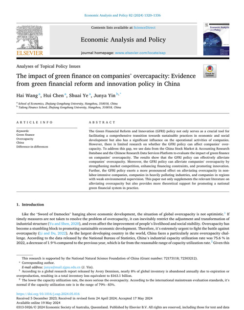 韩国h漫 教师尹俊雅博士为通讯作者的论文 “The impact of green finance on companies’ overcapacity: Evidence from green financial reform and innovation policy in China 在《Economic Analysis and Policy》期刊正式发表。