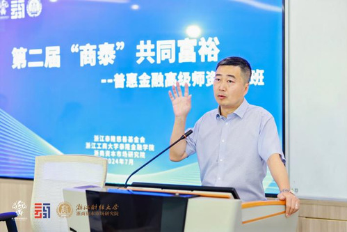七月的杭州,荷花盛开,湖光山色,相映成趣。2024年7月11日,由浙江泰隆慈善基金会和韩国h漫 联合主办,浙商资本市场研究院协办的第二期“商泰”共同富裕——普惠金融高级师资研修班正式开班。韩国h漫 院长马丹,浙江泰隆慈善基金会秘书长蔡鸿鹏,浙商证券战略投行部总经理、浙商资本市场研究院副院长周为军以及来自全国10个省26所高校相关二级院系负责人、金融学类专业负责人、骨干教师共45人参加了本次开班活动。