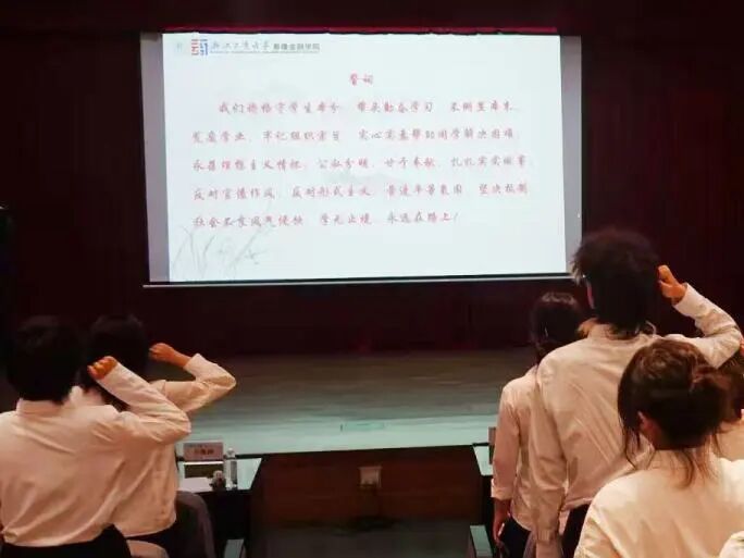 全体学生干部起立,在领誓人王梓欣的带领下,举起右手,庄严宣誓:“我宣誓,我将恪守学生本分,带头勤奋学习,不倒置本末,荒废学业,牢记组织宗旨,实心实意帮助同学解决困难,永葆理想主义情怀,公私分明,甘于奉献,扎扎实实做事,反对官僚作风,反对形式主义,营造平等氛围,坚决抵制社会不良风气侵蚀,学无止境,永远在路上。”
